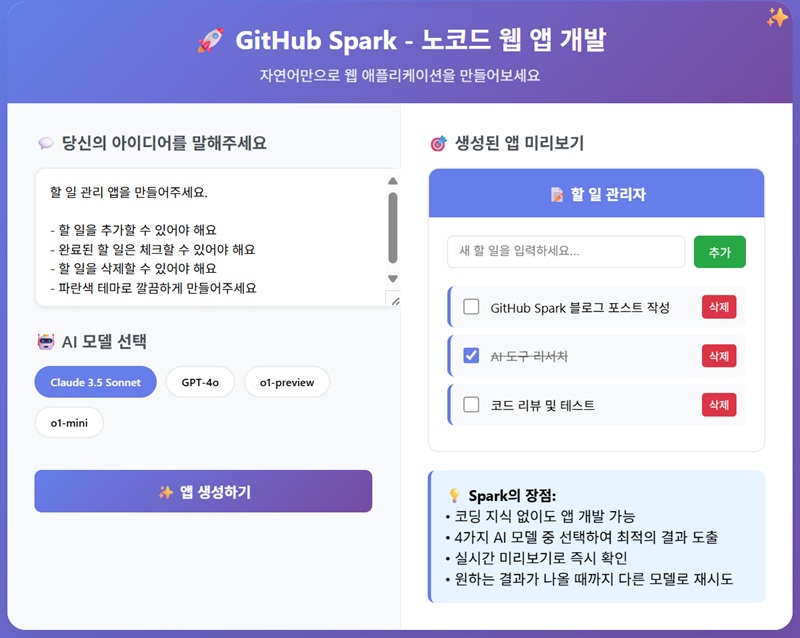 GitHub Spark는 2024년 GitHub Universe에서 발표된 혁신적인 도구로, 자연어만으로 웹 애플리케이션을 만들 수 있게 해줍니다.