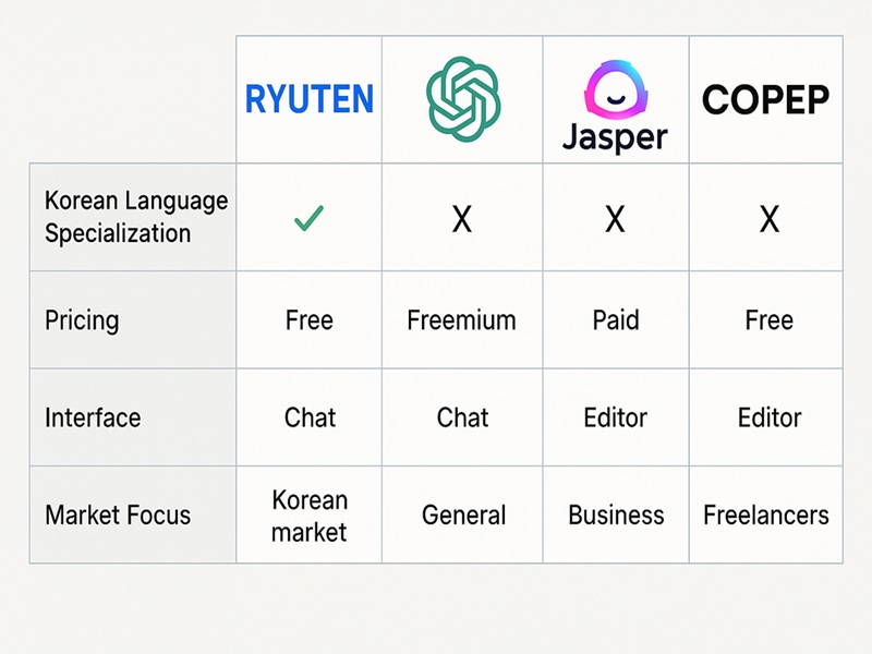 - Jasper AI: 마케팅 특화, 고급 기능 다수, 영어권 시장 최적화