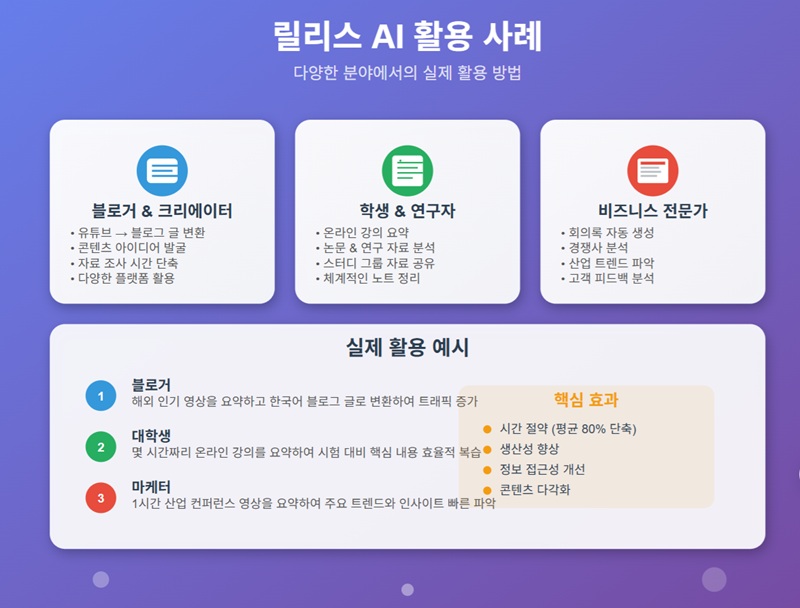 활용 예시: 대학생이 몇 시간짜리 온라인 강의를 릴리스 AI로 요약하여 시험 대비 핵심 내용을 효율적으로 복습할 수 있습니다.