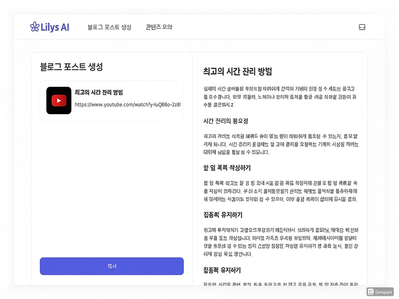 활용 예시: 인기 있는 해외 영상을 릴리스 AI로 요약하고 한국어 블로그 글로 변환하여 독자들에게 유용한 정보를 제공하면서 블로그 트래픽을 증가시킬 수 있습니다.