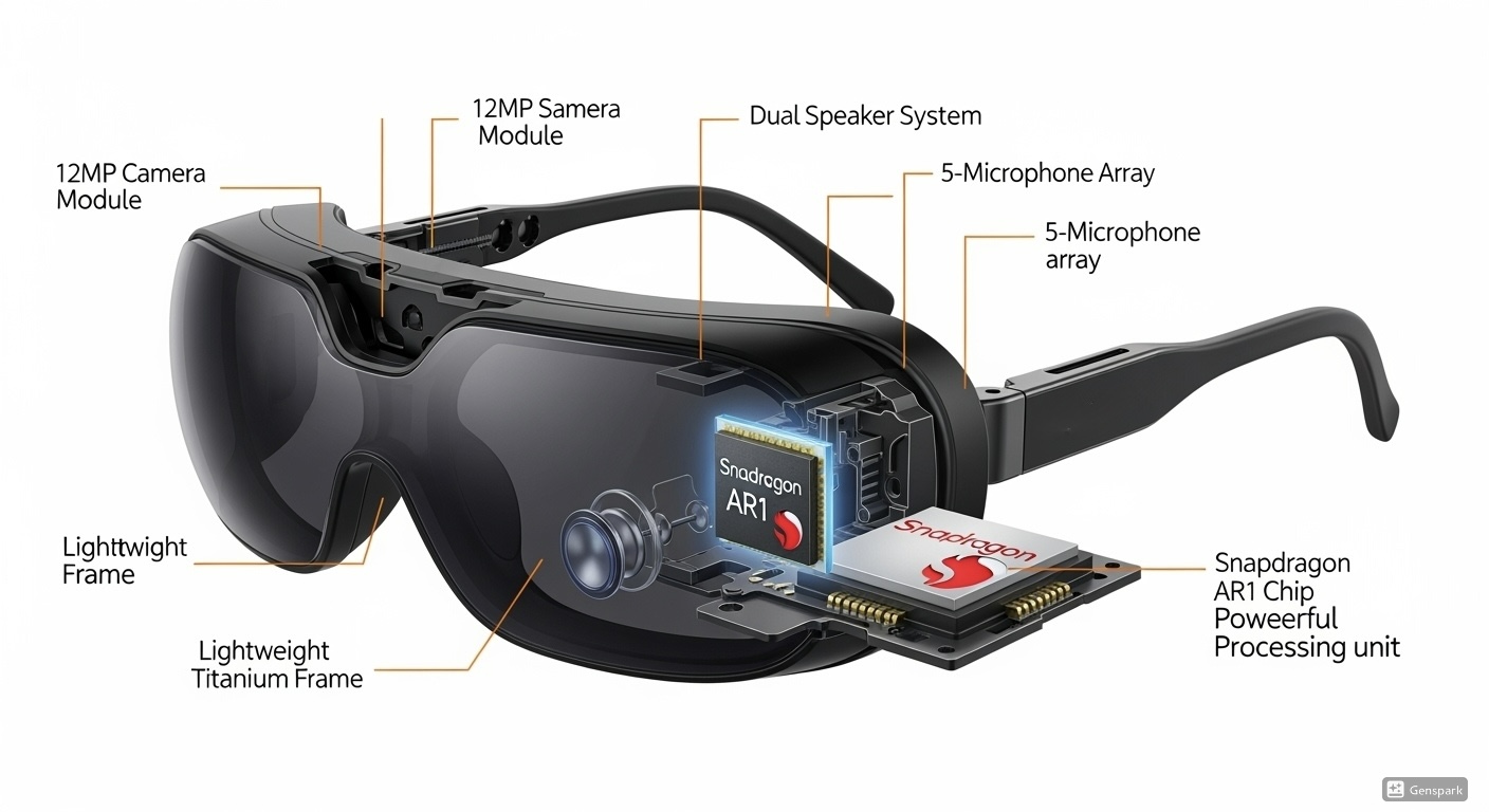 - 인체공학적 설계, 티타늄 합금 힌지, 소니 IMX681 기반의 12MP 1인칭 카메라, 듀얼 스피커, 5개 마이크 배열 탑재