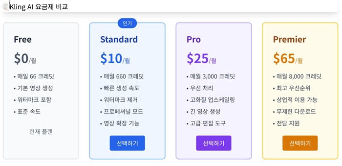- 동영상 길이: 5초(10크레딧), 10초(35크레딧), 최대 2분(프로모드)